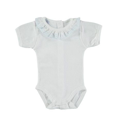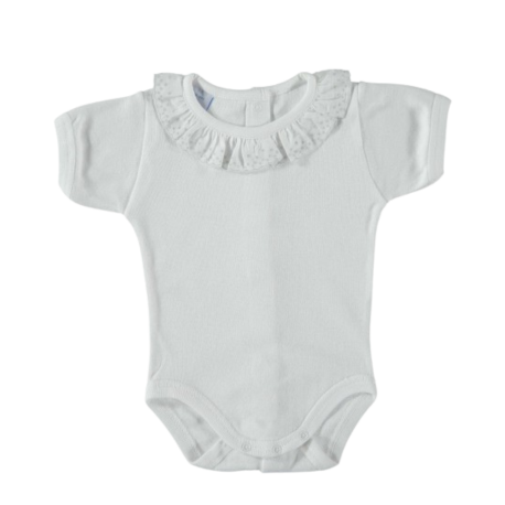 El Body manga corta cuello batista – Babidú es la prenda perfecta para mantener a tu bebé cómodo y elegante. Hecho con material suave y ligero, este body destaca por su cuello de batista con volante, que le da un toque delicado y elegante. Su diseño simple en color blanco lo hace muy versátil y fácil de combinar con otras prendas.