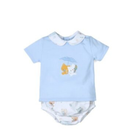 El Conjunto 2 Piezas Bebé Niño Gatitos – Tony Bambino es una opción encantadora y cómoda para tu bebé, ideal para los días calurosos. Este conjunto está compuesto por una camiseta azul de manga corta con un bordado de gatitos bajo un paraguas, y un culotte blanco con estampado de gatitos, lo que le da un toque tierno y divertido al look.
