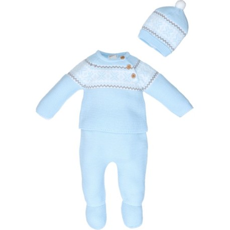 El Conjunto 3 Piezas Punto Bebé es la opción perfecta para mantener a tu bebé abrigado y cómodo. Este conjunto incluye un suéter de punto azul, unos pantalones a juego y un gorrito azul con detalles en blanco. Hecho con materiales de alta calidad, es ideal para mantener a tu bebé cómodo durante las temporadas más frescas sin comprometer el estilo.