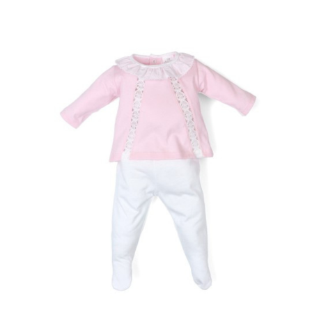 Este adorable conjunto de bebé, perfecto para los días más frescos, está compuesto por una blusa con cuello volante y polainas a juego. El top de manga larga está confeccionado en un suave algodón de alta calidad, ideal para la piel delicada del bebé. El detalle del cuello con volante en el tono rosa claro le da un toque muy elegante y dulce, mientras que las polainas blancas completan el conjunto de manera perfecta.
