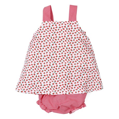 Este conjunto de dos piezas incluye una camiseta sin mangas con un encantador estampado de fresas y un cubrepañal a juego en diseño de cuadros rojos. Ambos están confeccionados con materiales suaves y cómodos, perfectos para la piel sensible de los bebés.