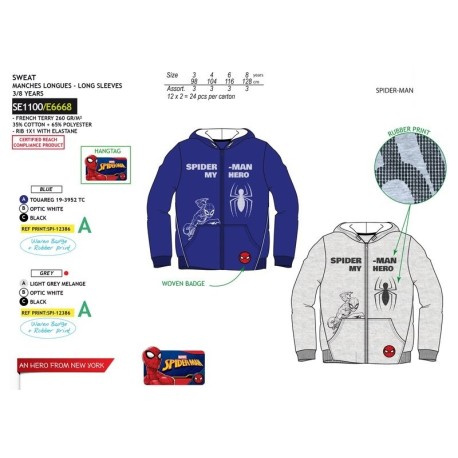 El estampado de Spiderman en la parte delantera aporta un toque divertido y lleno de personalidad. La capucha integrada brinda un extra de protección en días fríos o ventosos, mientras que el cierre de cremallera frontal facilita el vestir y desvestir del niño.